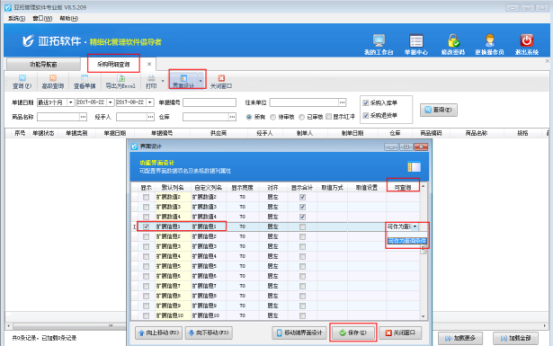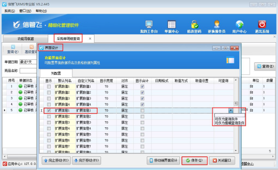 ????以“采購單明細查詢”為例,示范下如何在界面設計中配置。功能導航窗選擇“采購管理”在右側的查詢統計下打開“采購單明細查詢”進入采購單明細查詢界面,點擊“界面設計”按鈕,在打開的界面設計窗口中找到“擴展信息1”數據項,勾選顯示并在可查詢處設置“可作為查詢條件”,然后保存設置,如下圖所示: