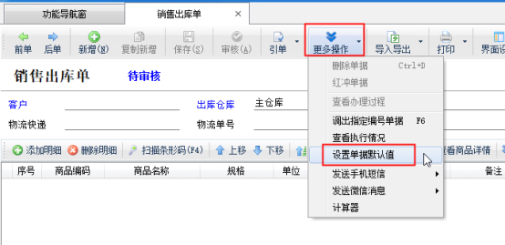 ????登錄軟件,在功能導航窗點“銷售管理”—》“銷售出庫單”,進入新開銷售單界面,如圖2所示,點擊“更多操作”按鈕,點擊“設置單據默認值”,系統彈出“設置單據默認值”窗口,如圖3所示。