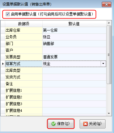 ????在“設置單據默認值”窗口,勾選“啟用單據默認值”,選擇需要設置的默認值后點擊“保存”按鈕進行保存。再次新增銷售出庫單時,單據主體上面會直接顯示設置好的數據項默認值,如圖4所示。