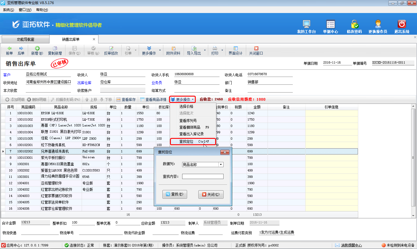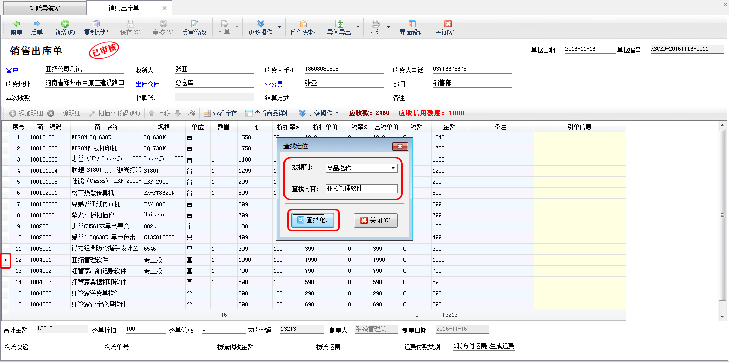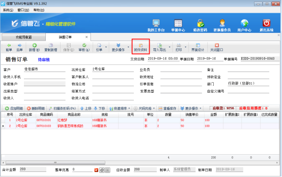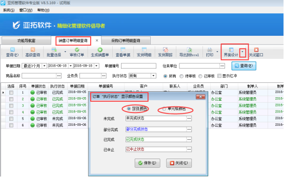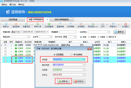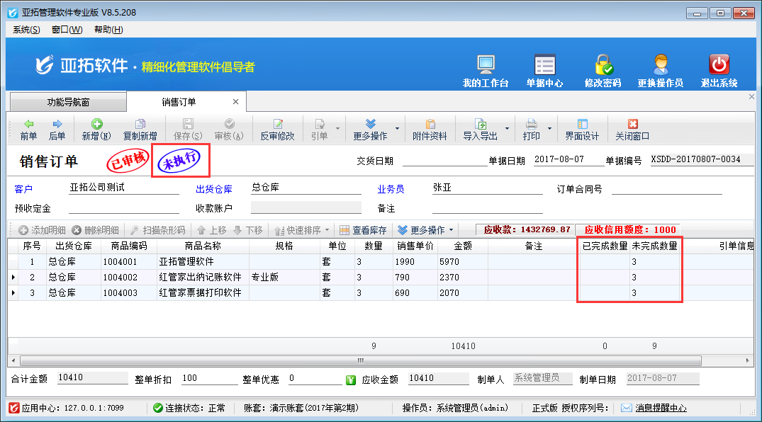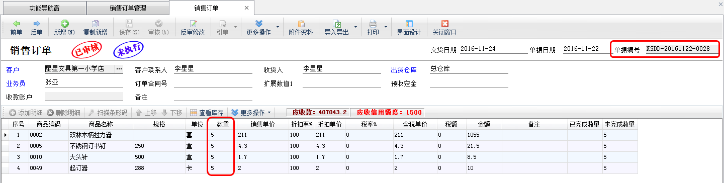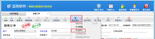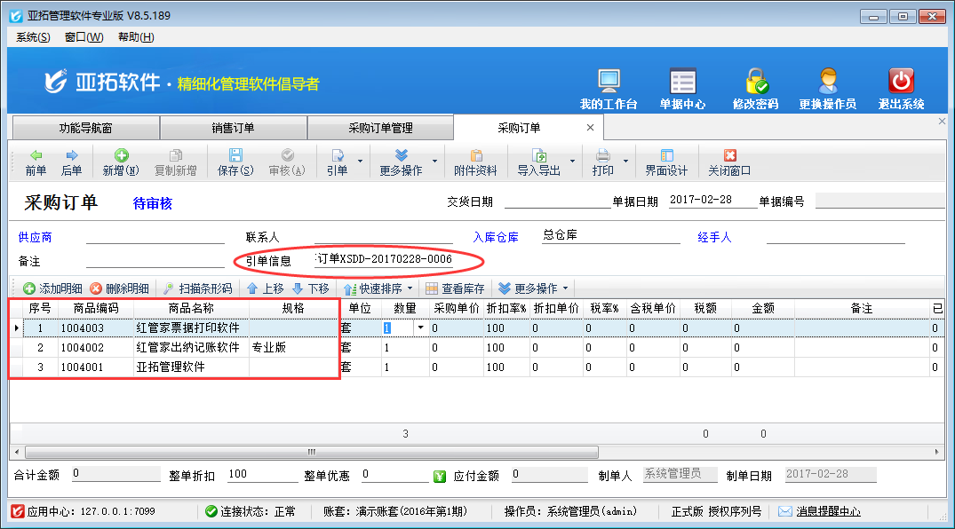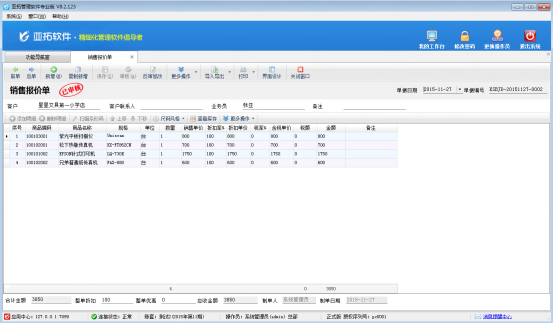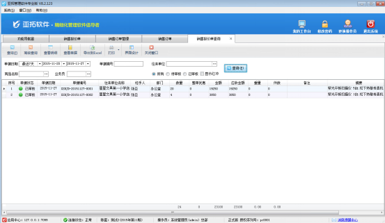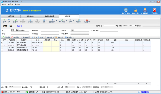 ????亞拓管理軟件星光版、標準版、專業版都支持在開采購訂單時直接引用銷售訂單明細數據,以專業版軟件為例,開采購訂單時如何直接引用銷售訂單明細數據?首先我們先開一個銷售訂單,保存并審核,如下圖所示: