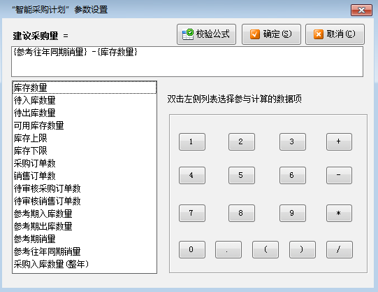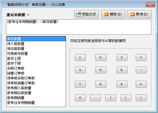 ????(1)參數設置:可以設置“建議采購量”的運算公式,軟件將根據您設計的公式計算出建議數量。