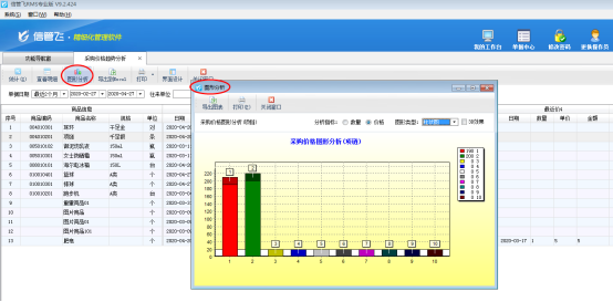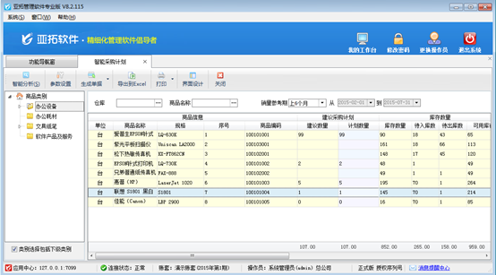 ????(2)智能分析:點“智能分析”按鈕,軟件會根據參數設置中設置的采購量運算公式計算出商品的“建議數量”,默認“計劃數量”(即后續生成訂單的數量)等于“建議數量”,您可根據業務情況,再手工調整“計劃數量”。