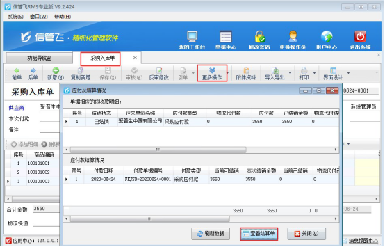 ????本篇文章以信管飛RMS為例,示范下如何修改應付款已結銷的采購入庫單單據,打開應付款已結銷的采購入庫單單據,在更多操作下點擊“查看應付款及結銷情況”,彈出應付款及結銷情況界面,點擊“查看結算單”可以打開本單據的應付款結算單界面,如下圖所示: