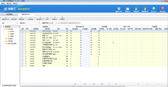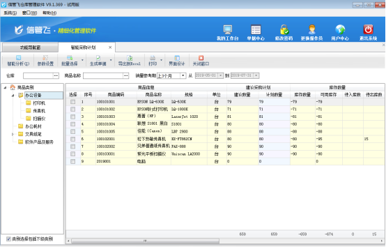 ????信管飛倉庫管理軟件支持由智能采購計劃生成采購計劃單。智能采購計劃可根據當前庫存情況,并可結合庫存上下限、同期銷售量、銷售訂單數量、待審核數量等條件進行組合運算,從而給出建議的商品采購量。可以把建議結果生成為采購訂單。智能采購計劃具體操作步驟如下: