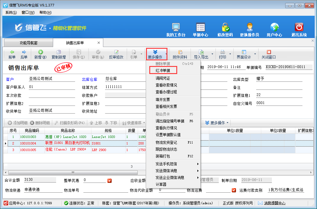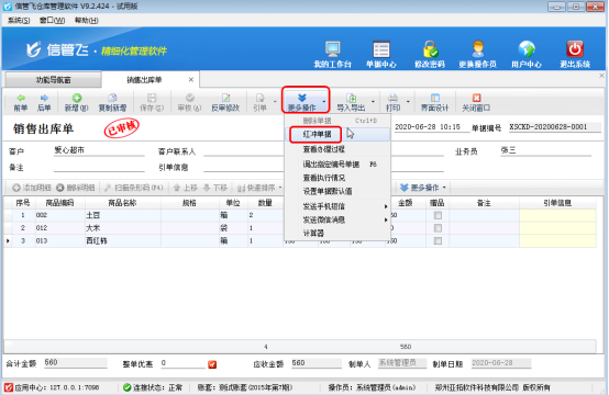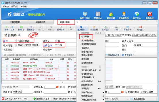 ????打開客戶名稱有誤的銷售出庫單,點擊“更多操作”—》“紅沖單據”,來將“已審核”的單據進行紅沖,紅沖后的單據會變為無效,紅沖相當于作廢,相應的應收款會刪除,之前對庫存的影響也會解除。如下圖所示: