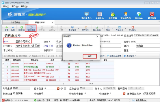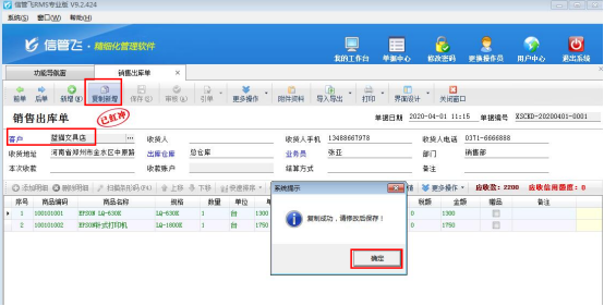 ????單據紅沖后,點擊工具欄中的“復制新增”按鈕,系統彈出提示框“復制成功,請修改后保存!”,點擊“確定”按鈕,如下圖所示: