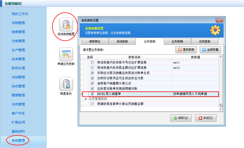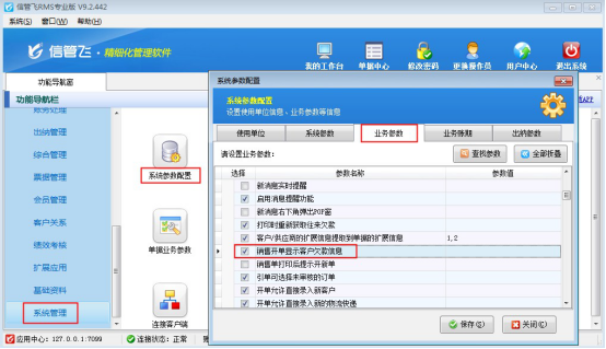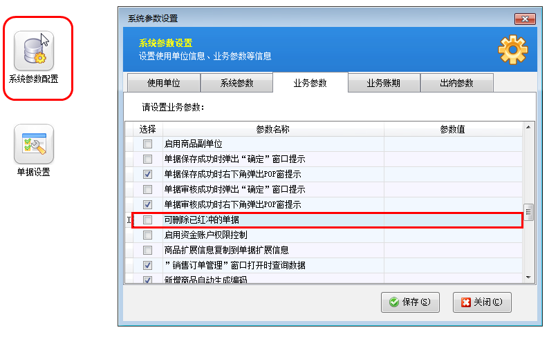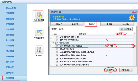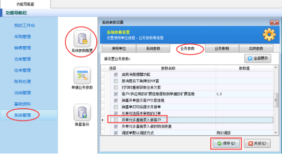 ????在功能導航窗點擊“系統管理”—》“系統參數配置”,進入系統參數配置界面,點擊“業務參數”,勾選“銷售(采購)退貨單可引用訂單”參數,點擊保存按鈕,如下圖所示: