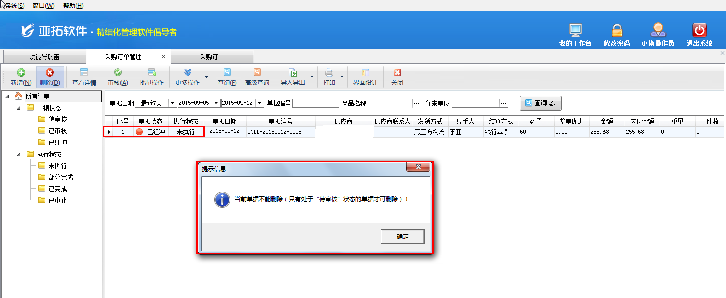 ????單據紅沖后即可進行刪除操作,如下圖所示: