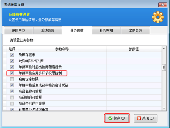 ????軟件多級審核最多支持5級審核,支持設置各類單據。本文以“銷售出庫單”為例示范。首先需啟用參數,在功能導航窗點“系統管理”→“系統參數配置”→“業務參數”,勾選“單據審核啟用多環節權限控制”,點擊“保存”按鈕,如下圖所示: