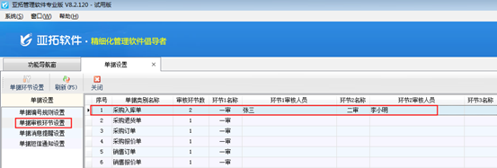 ????系統參數設置完成后,在“系統管理”→“單據業務參數”中選擇左側工具欄的“單據審核環節設置”,選擇“銷售出庫單”,點擊“單據環節設置”,啟用“一審”和“二審”并設置對應審核環節的審核人員“張亞”和“李拓”,然后保存設置,如下圖所示:
