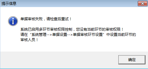 ????“一審”操作員“張亞”登錄軟件,新開銷售出庫單,保存并審核單據,審核狀態顯示“一審”,操作員“張亞”沒有二審權限,再次點擊“審核”會提示“系統已啟用多環節審核權限控制,您沒有當前環節的審核權限!”如下圖所示: