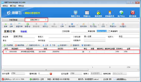 ????(3)生成單據:勾選需要的采購的商品記錄,點“生成單據”按鈕,軟件會將列表中“計劃數量”不為空的記錄生成為采購訂單。由智能采購計劃生成的采購訂單如下圖所示: