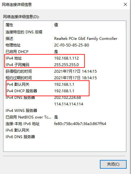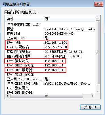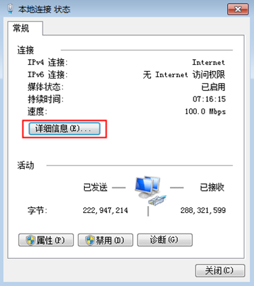 ????②本地連接狀態(tài)如圖所示,點(diǎn)擊“詳細(xì)信息”按鈕,會出現(xiàn)如圖所示的網(wǎng)絡(luò)連接詳細(xì)信息,此時(shí)需要記一下“IPv4地址”、“IPv4子網(wǎng)掩碼”、“IPv4默認(rèn)網(wǎng)關(guān)”和“IPv4 DNS服務(wù)器”的信息,后面固定IP地址時(shí)需要用到。