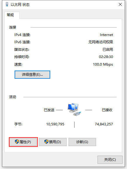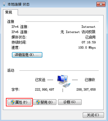 ????③把“網(wǎng)絡(luò)連接詳細(xì)信息”的界面關(guān)閉,回到“本地連接狀態(tài)”的界面,如圖所示,點(diǎn)擊“屬性”按鈕,會出現(xiàn)“本地連接屬性”的界面,如圖所示。
