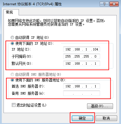????④在“Internet協(xié)議版本4(TCP/IPv4)屬性”的界面選擇“使用下面的IP地址”,把剛才得到的“IPv4地址”、“IPv4子網(wǎng)掩碼”、“IPv4默認(rèn)網(wǎng)關(guān)”和“IPv4 DNS服務(wù)器”的信息對應(yīng)填入完整,最后點(diǎn)擊“確定”按鈕即可。