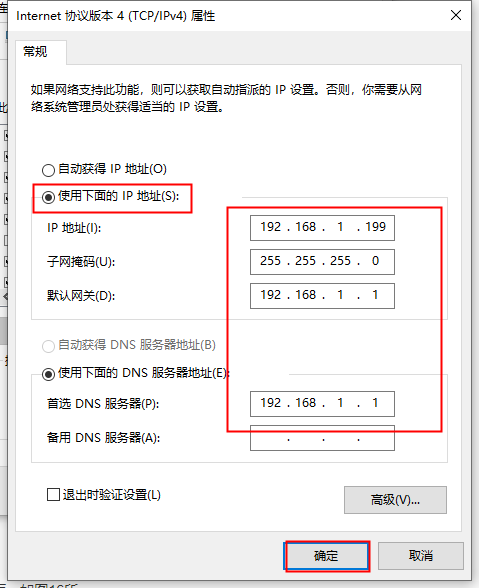 ????注意:此時(shí)的IP地址是可以自己設(shè)置的,為了避免IP地址沖突,建議在給主機(jī)電腦固定IP地址時(shí)把IP地址設(shè)置的大一些,可改為“192.168.1.199”,子網(wǎng)掩碼、默認(rèn)網(wǎng)關(guān)和DNS服務(wù)器信息則不能修改。