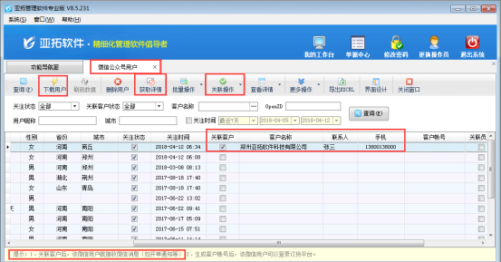 ????提示測試成功,則可以開業(yè)務(wù)單據(jù)發(fā)送微信消息。發(fā)送微信消息需要下載微信公眾號用戶并關(guān)聯(lián)軟件中客戶信息,在功能導(dǎo)航窗選擇“擴(kuò)展應(yīng)用”—》“微信公眾號用戶”,進(jìn)入微信公眾號用戶管理界面,點(diǎn)擊“下載用戶”可以下載關(guān)注公司微信公眾號的用戶(下載用戶速度有點(diǎn)慢,請耐心等待一下)。下載完成后,工具欄點(diǎn)擊“獲取詳情”可以獲取關(guān)注用戶的信息。對用戶關(guān)聯(lián)下軟件中所對應(yīng)的客戶。如下圖所示: