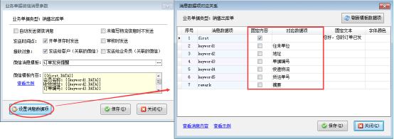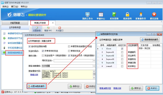 ????模板消息添加完成后,需要設(shè)置微信模板消息和軟件數(shù)據(jù)項(xiàng)的對應(yīng)。如下圖所示: