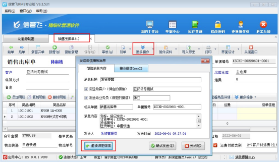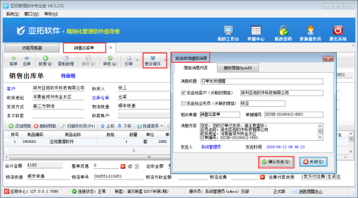 ????微信消息參數(shù)設(shè)置完成后,新開一個(gè)銷售出庫單,客戶調(diào)用已關(guān)聯(lián)客戶,輸入明細(xì)內(nèi)容后點(diǎn)擊保存按鈕,然后在工具欄“更多操作”按鈕下選擇“發(fā)送微信消息”點(diǎn)擊“確認(rèn)發(fā)送”會發(fā)送到客戶關(guān)注的微信公眾號平臺界面。如下圖所示: