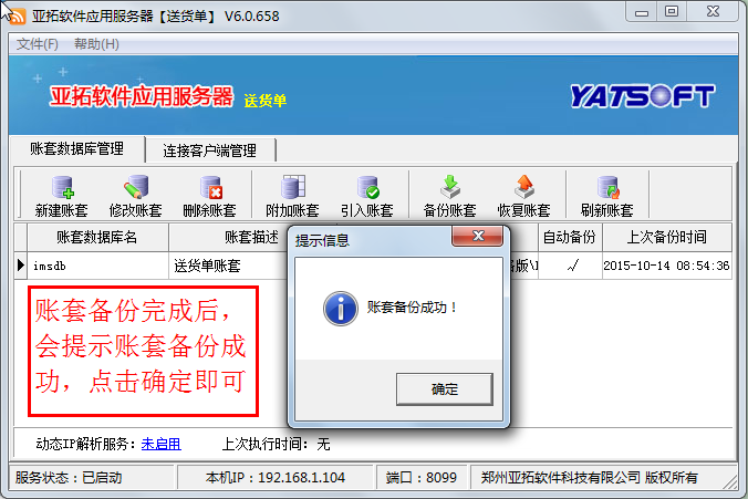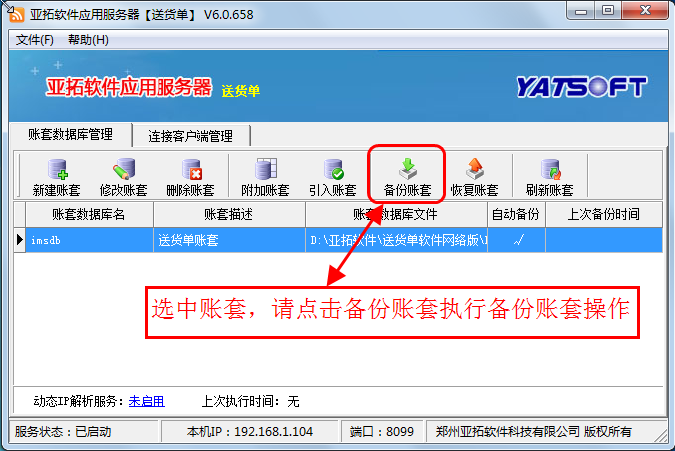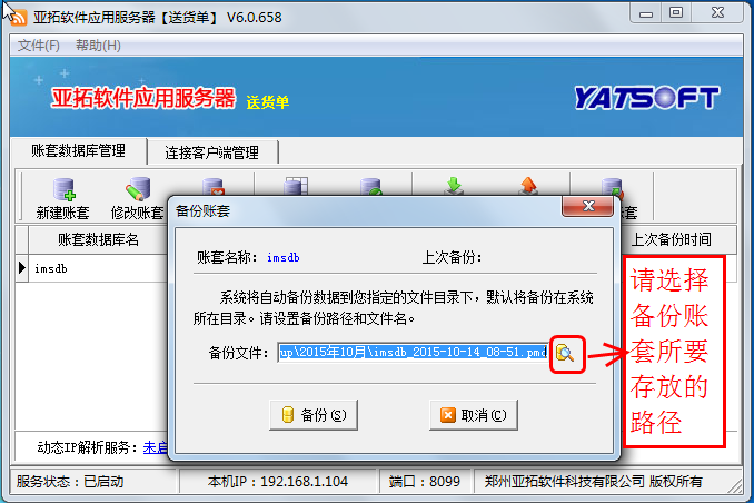 ????先在原主機(jī)上登錄軟件檢查下數(shù)據(jù),確認(rèn)沒問題后,打開亞拓軟件應(yīng)用服務(wù)器,在亞拓軟件應(yīng)用服務(wù)器上選中賬套,點(diǎn)擊“備份賬套”執(zhí)行備份賬套操作,點(diǎn)擊備份賬套后,會彈出“備份賬套”窗口,可以選擇備份文件所存放的路徑(一般情況下默認(rèn)存放在軟件的安裝目錄下DBBackup文件夾下),然后將剛才備份的賬套數(shù)據(jù)文件通過U盤或者移動硬盤等方式拷貝到新主機(jī)電腦上。