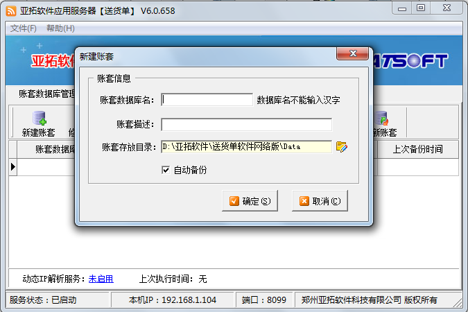 ????我公司開發(fā)的紅管家送貨單打印軟件、紅管家財(cái)務(wù)出納記賬系統(tǒng)、紅管家票據(jù)打印軟件、亞拓管理軟件(進(jìn)銷存軟件)和亞拓倉庫管理軟件的相應(yīng)網(wǎng)絡(luò)版本都支持通過互聯(lián)網(wǎng)遠(yuǎn)程使用,如果沒有固定的公網(wǎng)IP地址(一般撥號上網(wǎng)都是每次變化),需要購買增值服務(wù):動態(tài)IP解析服務(wù)(按年收費(fèi))。