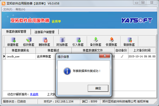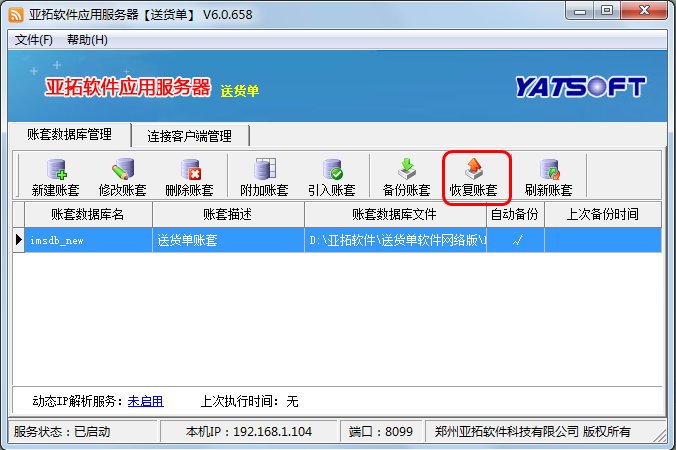 ????在新主機(jī)電腦上安裝軟件,打開亞拓軟件應(yīng)用服務(wù)器,然后點(diǎn)擊“新建賬套”,執(zhí)行新建賬套操作,賬套名為此前備份的賬套名,新建賬套完成后,選擇此新建的賬套,點(diǎn)“恢復(fù)賬套”,選擇此前拷貝過來的備份賬套文件進(jìn)行恢復(fù)數(shù)據(jù),數(shù)據(jù)恢復(fù)后,在登錄窗口選擇賬套登錄,檢查下數(shù)據(jù)是否完全恢復(fù)。