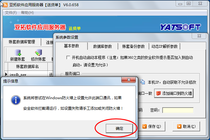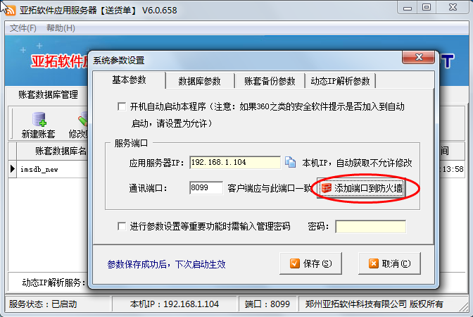 ????主機(jī)沒問題后,客戶端電腦有時(shí)可能無法連接主機(jī),登錄失敗,此時(shí)請固定主機(jī)IP地址,另:打開亞拓軟件應(yīng)用服務(wù)器,點(diǎn)“文件”——》“系統(tǒng)參數(shù)設(shè)置”——》“基本參數(shù)”——》“添加端口到防火墻”。(為什么需固定主機(jī)IP地址及如何固定IP地址請參見這篇文章:網(wǎng)絡(luò)版軟件固定主機(jī)IP地址的方法)