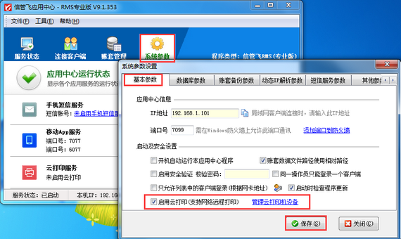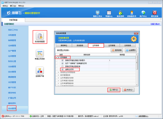 ????云打印機(jī)設(shè)備設(shè)置完成后,登錄軟件,需要設(shè)置云打印參數(shù),在功能導(dǎo)航窗點(diǎn)擊“系統(tǒng)管理”->“系統(tǒng)參數(shù)設(shè)置”->“業(yè)務(wù)參數(shù)”打開業(yè)務(wù)參數(shù)設(shè)置窗口,在“打印參數(shù)”內(nèi)打鉤啟用“啟用云打印”參數(shù),然后點(diǎn)擊“保存”按鈕保存設(shè)置,如下圖三所示。
