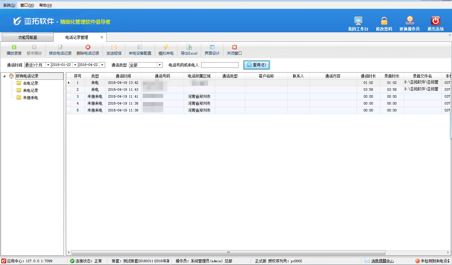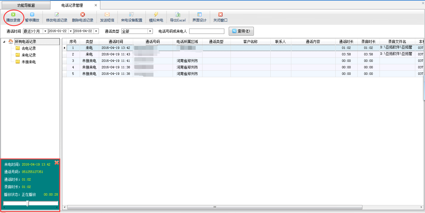 ????在電話記錄管理界面選擇通話時(shí)間,輸入來電號碼或者來電人信息查詢即可查詢到我們所需要的來電信息,選擇所需要的來電信息,點(diǎn)擊“播放錄音”按鈕即可播放當(dāng)前來電的通話自動錄音。