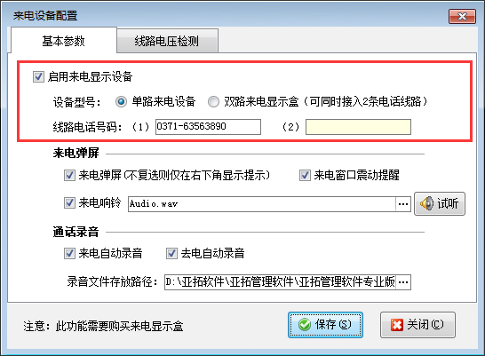 ????來電設(shè)備配置:使用來電彈屏功能首先需要外接設(shè)備來電顯示盒,來電顯示盒連接配置好之后需要在軟件內(nèi)啟用來電顯示設(shè)備并設(shè)置線路電話號碼,來電顯示配置如下圖所示:
