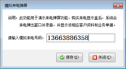 ????模擬來電:此功能可以實(shí)際模擬演示來電彈屏功能,在模擬來電彈屏窗口輸入模擬來電號碼,點(diǎn)擊“保存”后系統(tǒng)會自動彈出來電彈屏窗口,如下圖所示: