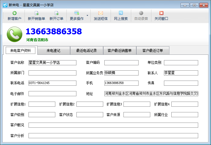 ????來電彈屏:客戶來電時(shí),來電彈屏窗口會自動顯示出在“基礎(chǔ)資料”——》“客戶資料”內(nèi)維護(hù)好的此客戶的相關(guān)信息、客戶最近電話記錄、客戶最近銷售單及客戶最近訂單,使得您可以在通話之前可以全面了解客戶信息。