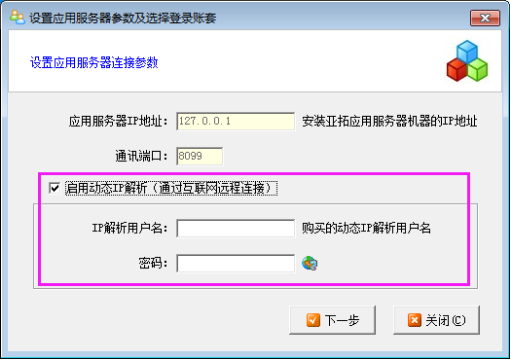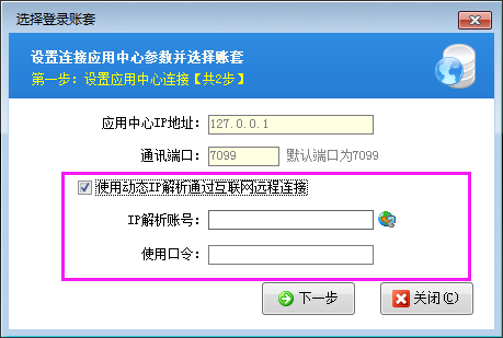 ????打開客戶端登錄界面的“選擇賬套”按鈕,然后勾選“啟用動態(tài)IP解析”,填寫IP解析用戶名和密碼,點(diǎn)擊“下一步”,進(jìn)入選擇賬套的界面,選擇賬套后回到登錄界面,選擇操作員并輸入密碼,進(jìn)入軟件首頁。