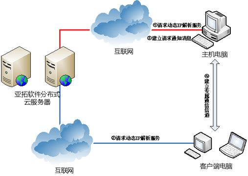 ????①主機(jī)電腦向亞拓軟件云服務(wù)器發(fā)送動態(tài)IP解析服務(wù)請求。