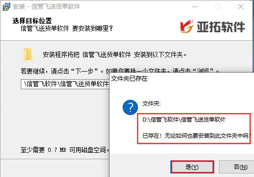 ????刪除后邊重復(fù)的內(nèi)容,點(diǎn)擊下一步,會提示文件夾中已存在軟件,是否繼續(xù)安裝在此文件夾,點(diǎn)擊“是”表示覆蓋安裝到之前的文件夾中。如下圖所示:
