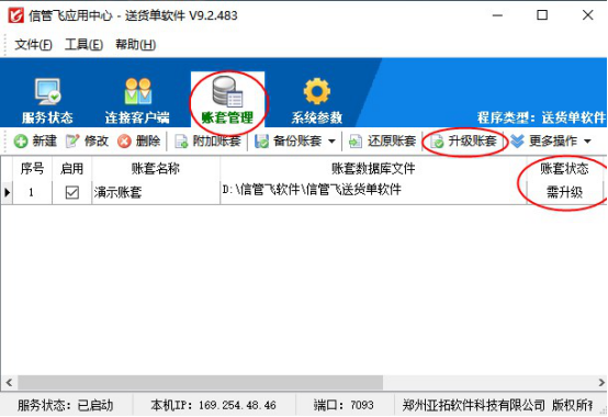 ????軟件安裝完成后,運(yùn)行應(yīng)用中心和客戶端程序,在應(yīng)用中心界面,選擇賬套管理,顯示之前的所有賬套信息,賬套狀態(tài)為“需升級”,在賬套管理界面點(diǎn)擊升級下賬套,升級賬套不影響數(shù)據(jù)!(也可登錄時(shí)直接升級),如下圖所示: