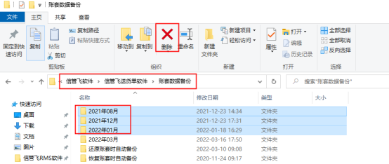 ????打開D盤信管飛軟件—信管飛送貨單軟件—賬套數(shù)據(jù)備份文件夾(或者桌面圖標(biāo)鼠標(biāo)右鍵打開文件位置,快速打開文件所在目錄),可刪除掉除最近日期的所有備份數(shù)據(jù),如下圖所示: