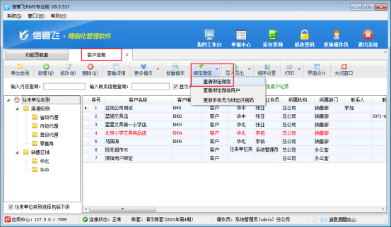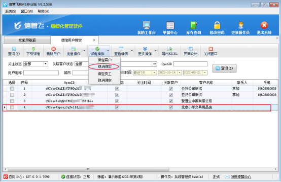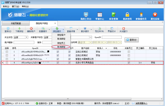 ????若是綁定有誤或者更換綁定客戶或業(yè)務(wù)員可進(jìn)行解除綁定再重新綁定。如何取消綁定?本文以信管飛RMS軟件為例示范如下: