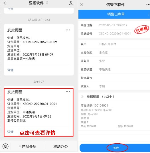 ????設(shè)置微信消息發(fā)送配置以及綁定好客戶或者業(yè)務(wù)員后,開單發(fā)送微信消息,客戶可在關(guān)注的微信公眾號平臺上接收到微信消息,點(diǎn)擊接收消息可查看開單詳情(可電腦界面設(shè)計(jì)配置外部客戶可查看內(nèi)容),客戶收到貨后可微信上進(jìn)行簽收操作,簽收完成后軟件開單界面的附件資料中可查看到客戶的簽字信息。如下圖所示: