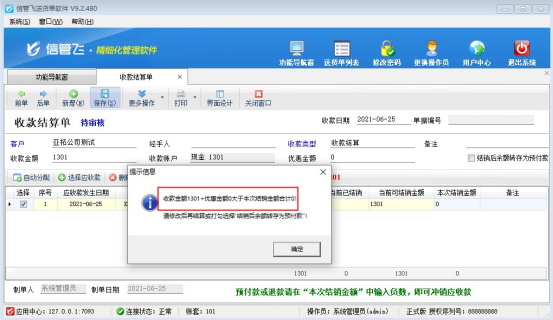 ????一、保存時(shí)提示“收款金額+優(yōu)惠金額大于本次結(jié)銷金額合計(jì)”,無法保存。如下圖所示:
