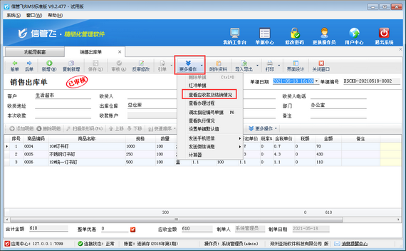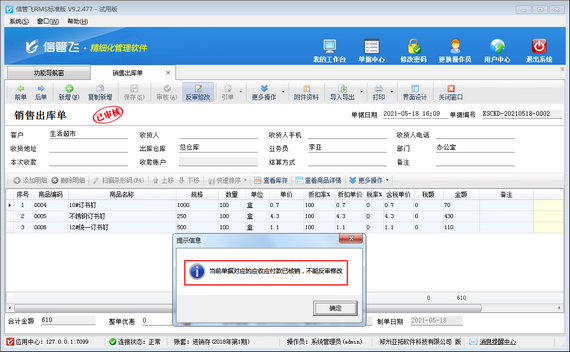 ????信管飛RMS是進(jìn)銷存一體化的軟件,支持管理往來應(yīng)收應(yīng)付款,銷售出庫(kù)單審核后自動(dòng)生成銷售應(yīng)收款信息,可以對(duì)銷售應(yīng)收款進(jìn)行收款結(jié)算,如銷售應(yīng)收款已結(jié)銷的情況下,發(fā)現(xiàn)銷售出庫(kù)單有填開錯(cuò)誤,需要修改,系統(tǒng)默認(rèn)是不能直接進(jìn)行反審修改操作,如下圖所示。