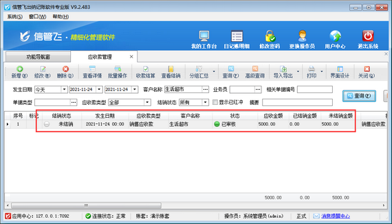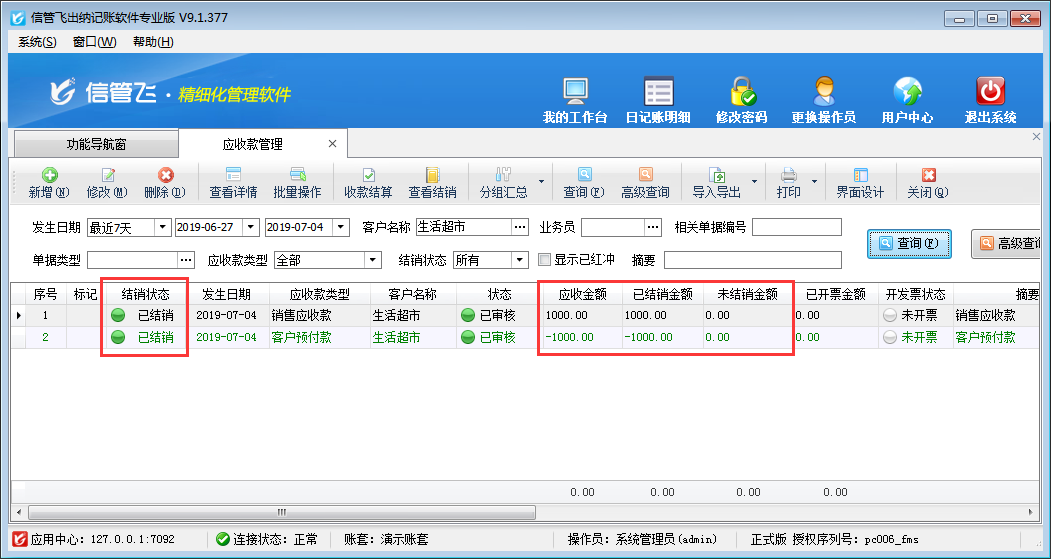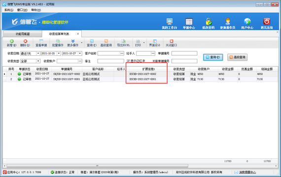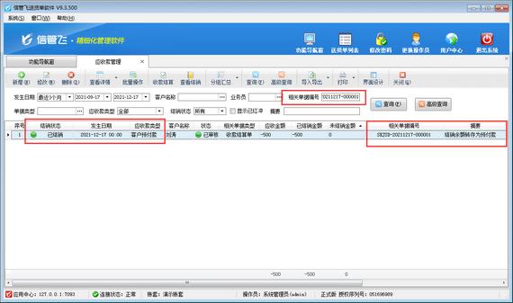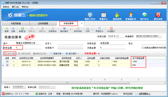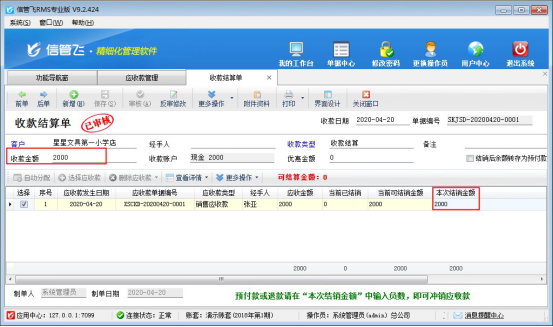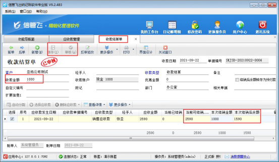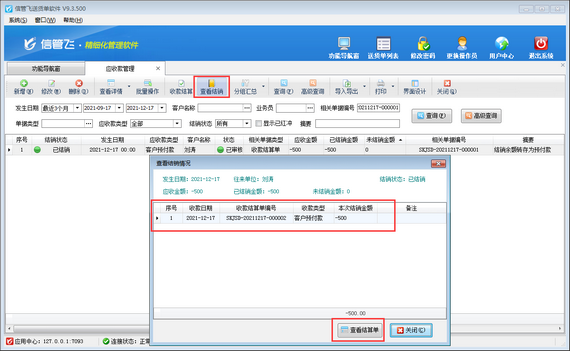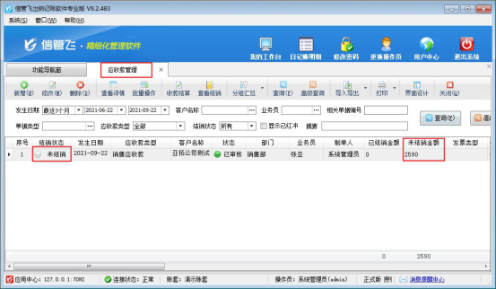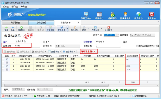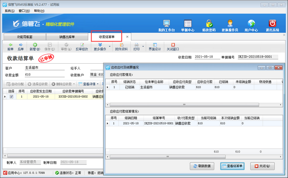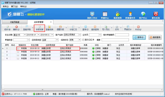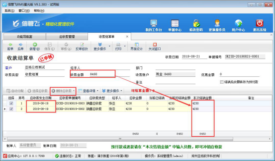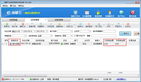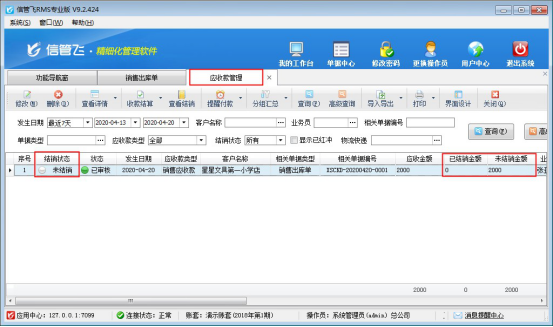 ????結(jié)算單審核完成后會(huì)影響應(yīng)收款的結(jié)銷狀態(tài)。如果需要按單據(jù)進(jìn)行分批結(jié)銷可參考此文章:信管飛RMS 軟件如何按單據(jù)部分結(jié)銷應(yīng)收款?