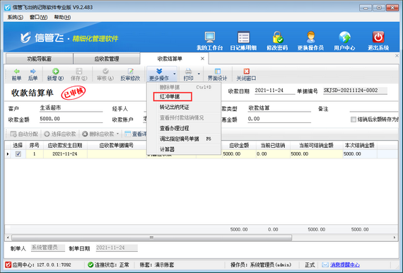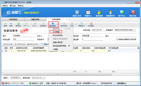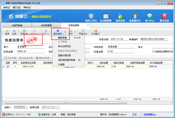 ????然后在收款結(jié)算單界面點(diǎn)擊“更多操作”—》“紅沖單據(jù)”,如下圖所示,單據(jù)紅沖后,點(diǎn)擊“更多操作”—》“刪除按鈕”,即可刪除收款結(jié)算單。
