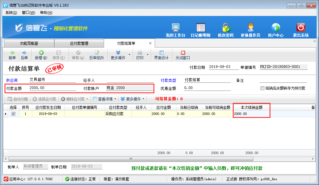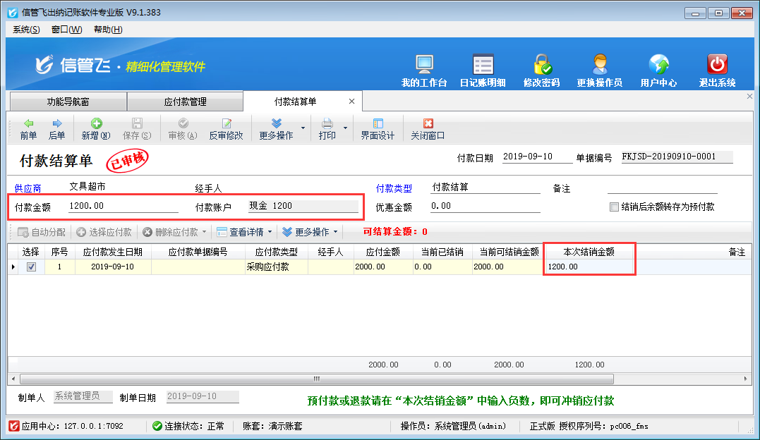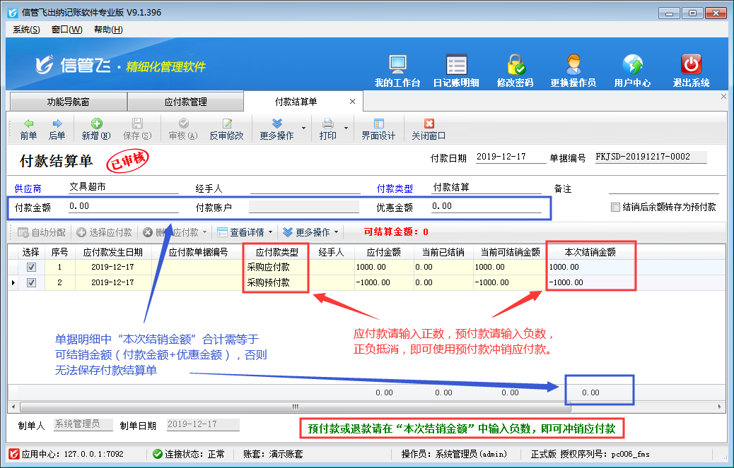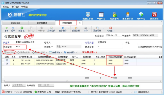 ????在應(yīng)付款管理界面,點(diǎn)擊工具欄的“付款結(jié)算”按鈕,進(jìn)入付款結(jié)算單界面,預(yù)付定金為1000,應(yīng)付款為10000,所以付款金額需要減去定金金額,實(shí)付9000,然后點(diǎn)擊自動(dòng)分配按鈕把可結(jié)銷金額分配至本次結(jié)銷金額中,保存審核付款結(jié)算單。
