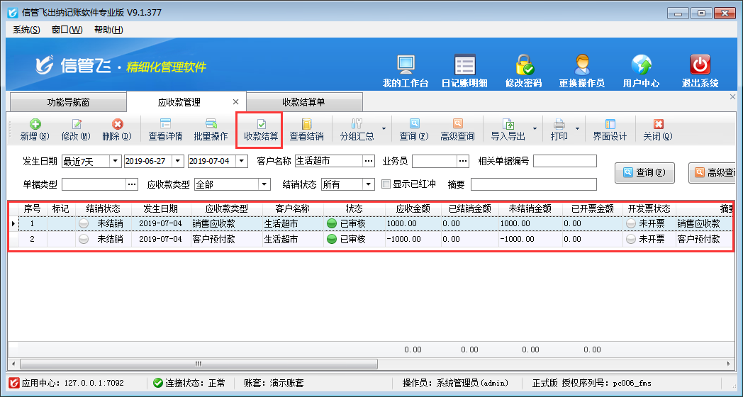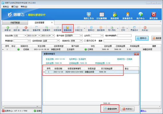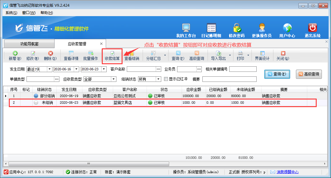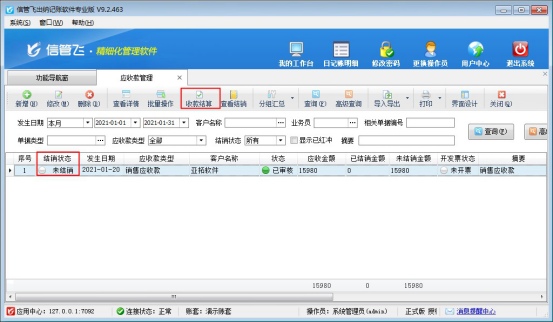 ????信管飛出納記賬軟件可以對(duì)應(yīng)收款進(jìn)行收款結(jié)算,對(duì)應(yīng)付款做付款結(jié)算。對(duì)應(yīng)收款進(jìn)行收款結(jié)算后,如何快速找到這個(gè)應(yīng)收款對(duì)應(yīng)的收款結(jié)算單呢?本文以信管飛出納記賬軟件專業(yè)版為例介紹一下如何查看應(yīng)收款對(duì)應(yīng)的收款結(jié)算單?
