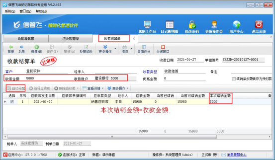 ????在收款結(jié)算單界面,默認(rèn)是獲取此客戶所有未結(jié)銷的應(yīng)收款。收款金額輸入本次收款5000元,然后點(diǎn)擊“自動(dòng)分配”,可把收款金額分配到本次結(jié)銷金額明細(xì)中。分配完成后點(diǎn)擊保存并審核結(jié)算單。則本次收款完成,如下圖所示: