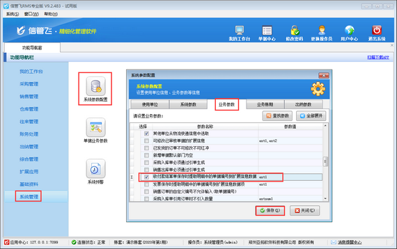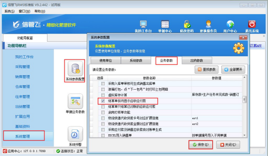 ????在功能導(dǎo)航窗點(diǎn)擊“系統(tǒng)管理”—》“系統(tǒng)參數(shù)配置”選擇“業(yè)務(wù)參數(shù)”,勾選“特殊功能數(shù)”下的“結(jié)算單按月顯示應(yīng)收應(yīng)付款”,然后保存設(shè)置,如下圖所示: