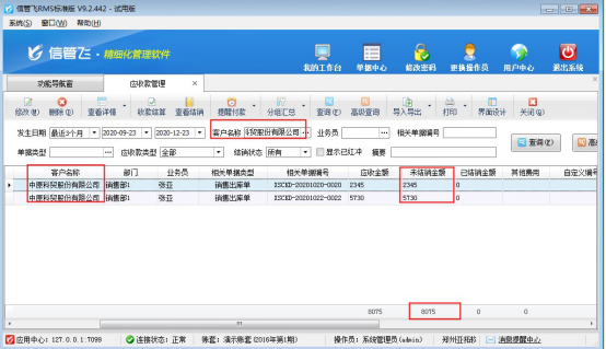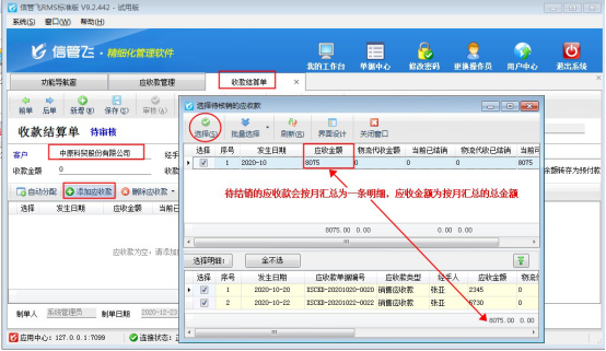????參數(shù)設(shè)置完成后,功能導(dǎo)航窗點(diǎn)擊“往來管理”—》“應(yīng)收款管理”可查看所有應(yīng)收款記錄。選擇示例客戶“中原科貿(mào)股份有限公司”匯總其應(yīng)收款,可看到有10月兩筆待結(jié)銷應(yīng)收款記錄。總金額為:8075元,如下圖所示: