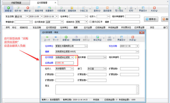 ????在功能導(dǎo)航窗點(diǎn)擊“往來管理”—》“應(yīng)付款管理”,即可打開應(yīng)付款管理界面,在工具欄點(diǎn)擊“新增”按鈕,系統(tǒng)打開新增應(yīng)付款窗口,如下圖所示,“應(yīng)付類型”選擇為“采購(gòu)?fù)素洃?yīng)退款”,然后錄入應(yīng)退金額及其他數(shù)據(jù)后保存此應(yīng)付款信息即可。