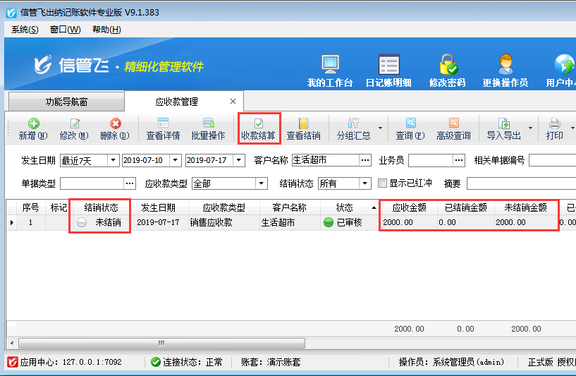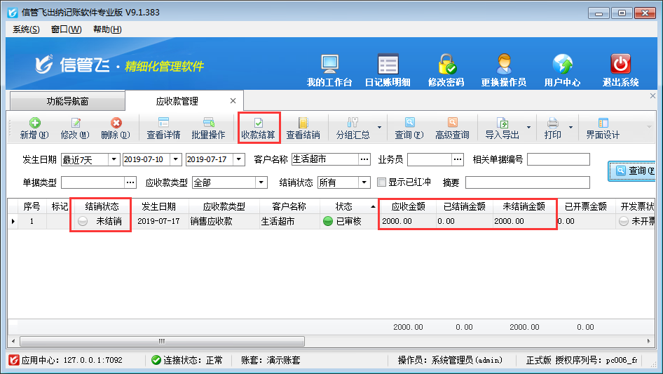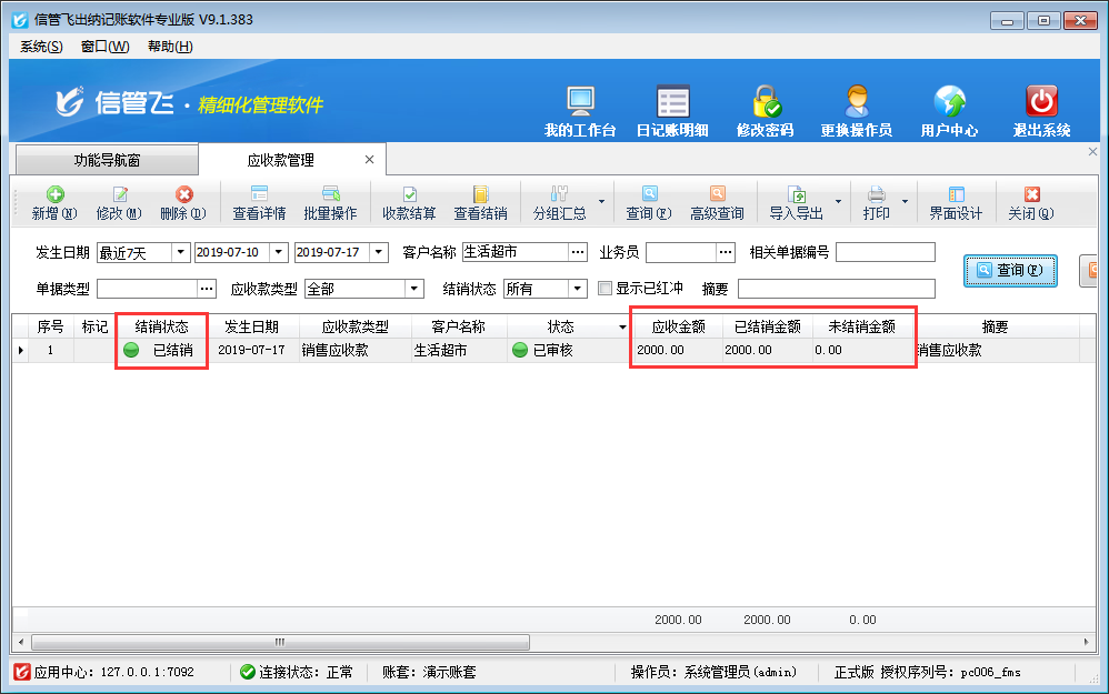 ????收款結(jié)算單單據(jù)審核之后,更新應(yīng)收款的結(jié)銷狀態(tài),在應(yīng)收款管理界面可以查看應(yīng)收款結(jié)銷情況,如下圖所示,客戶“生活超市”應(yīng)收金額2000元已結(jié)銷,未結(jié)銷金額為0。